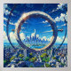 Artwork of a futuristic gateway leading into the city. This awe-inspiring artwork presents a vibrant metropolis nestled within a lush landscape, framed by a colossal ring structure in the sky. It's a depiction of a harmonious future where advanced technology meets natural beauty, with towering skyscrapers reflected in a tranquil lake and surrounded by green fields. This piece is perfect for lovers of science fiction, architecture, and optimistic visions of tomorrow. A stunning illustration of monumental architecture meeting breathtaking nature. A vast circular structure dominates the sky, framing a panoramic view of a futuristic city below. Add a touch of visionary inspiration to your home with this captivating piece. This artwork can be customized, printed, and or downloaded.