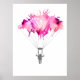 Sky dive parachutist hanging on a watercolor splash cloud of bright pink colour shades.