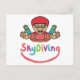 A fun Skydiving design shows a skydiver with helmet, goggles, thumbs up and legs splayed out behind. Falling through the air waiting for the right moment to deploy the parachute. The word "Skydiving" underneath with the "g" turning into a big smile.
