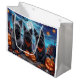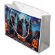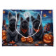 Unleash the spooky spirit with this eerie Halloween design featuring a pack of dogs under a dark, moonlit sky, surrounded by flying bats and glowing pumpkins. Perfect for those who love a touch of frightful fun with their furry friends!
