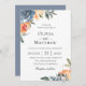 Beautiful watercolor, slate blue and peach, botanical flowers and foliage, wedding invitation. Font style and colour can be customized. Back of card features solid slate blue colour.