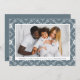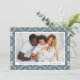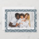 Festive holiday card featuring your horizontal photo framed in white with a slate blue and white nordic snowflake patterned background. Personalize the nordic snowflake Christmas card with your custom greeting and family name in slate blue lettering. The card reverses to display your personal message.