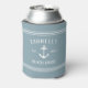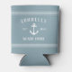 These cool personalized beach house can coolers feature your family name on a coastal slate blue background, with your year established and a nautical anchor illustration. Rope stripe detailing at the top and bottom completes the design for a rustic look.