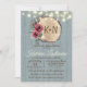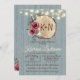 Rustic Woodland Burgundy Rose watercolor floral and wood slab wedding or bridal shower invitation has carved tree slice with monogram and unique smokey slate blue barn wood back drop decorated with popular trending twinkle string lights that sparkle over top. Elegant script fonts and fun typography style information can be personalized as preferred.
