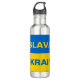 Ce design de bouteille d'eau bleu et or royal aide à montrer votre soutien à l'Ukraine et au peuple ukrainien. Slava Ukraini est un salut national de souveraineté. Le design a "Slava" en lettres jaunes sur bleu azur, avec un tournesol doré de chaque côté, avec "Ukraini" en lettres bleues sur jaune.