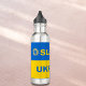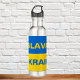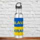 This royal blue and gold water bottle design helps show your support of Ukraine and the Ukrainian people. Slava Ukraini is a national salute of sovereignty. The design has "Slava" in yellow lettering on azure blue, with a golden sunflower on each side, with "Ukraini" in blue letters on yellow.
