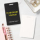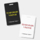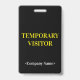 This sleek badge design features the message "TEMPORARY VISITOR", and a customizable company name or other custom message. A badge like this could be used to identify that somebody at a workplace or business is an authorized guest/visitor. [~Z0000307]