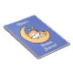 Cute ginger kitten fast asleep on a yellow crescent moon. Around her head are three yellow stars. Above and below of the image are templates to add your own text to personalize.