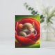 A cute, fluffy mouse peacefully sleeping inside a vibrant red poppy flower. The petals of the flower are soft and detailed, surrounding the mouse like a cozy bed. The background features gentle green hues, creating a serene and tranquil atmosphere, with a hint of sparkling light to add a magical touch.