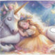 A tender dreamscape unfolds as a sleeping girl rests against a gentle unicorn beneath a twilight sky glowing with soft light and drifting butterflies. Flowing hair, floral crowns, and painterly details create a soothing, storybook mood filled with innocence, comfort, and quiet magic. The palette blends creamy whites, blush pinks, warm golds, and serene twilight blues, wrapped in a whimsical cottagecore fantasy aesthetic that feels nurturing, peaceful, and timeless. AI generated artwork.