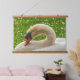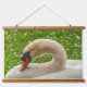 A close-up photograph captures a mute swan in a serene moment of slumbering. Its head is bent down, its orange beak gently cleaning its soft, white feathers. The swan's black eyes are closed, suggesting a state of relaxation. The background is a blur of green grass and white flowers, creating a peaceful and natural setting.