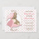 This cute baby shower invitation features an adorable, sleepy little brown teddy bear with a pink and white striped cap and pink blankets. The image is framed in a thin brown line circle, and set against a pink and brown polkadot background. There is a custom text field in brown at the top and bottom, and your information is in dark pink and brown at the right. The back of the invitation is matching pink. Be sure to see the matching products in our store.
