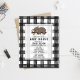 A baby shower invitation featuring an illustration of a baby bear over a black gingham background. Personalize the black text.