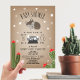 A baby shower invitation featuring an illustration of a baby wolf pup surrounded by stars. Mountain illustration and cactus at bottom. Personalize the text. Background is card stock inspired.