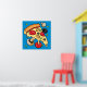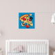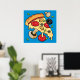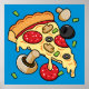 Colorful pop art style slice of pizza with pepperoni, mushrooms, green pepper and olive toppings.