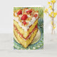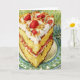 From a vintage magazine. An illustration of a thick slice of white layer cake with strawberry filling. White frosting and strawberries are on top. It's set on a pretty plate with a green and blue patterned edge