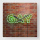 SlipperyJoe illuminated gay neon sign bright vivid electric green lights letters mounted reddish-brown brick wall gay pride gifts identity celebration LGBTQIA urban industrial look celebration love identity community live your truth visibility power vibrant glow contrasts textured backdrop sleek electric curves artistic casting lively aura