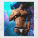 SlipperyJoe muscular man underwear bulge vibrant hues blue teal purple cloud-like abstraction gay pride gifts LGBTQIA artistic dreamlike abstract energy psychedelic surrealism cosmic effect surreal and imaginative background hand rests over chest