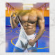 SlipperyJoe's muscular man bulge six-pack gym training facility white athletic singlet blue red ropes hanging from ceiling pulling spandex away from body gay pride gifts LGBTQIA artistic wrestling mat yellow circles padded walls line the room fluorescent lights cast stark glow