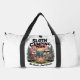 This white duffle bag showcases a delightful cartoon of two sloths in camping chairs by a campfire, with "SLOTH CAMPING TEAM" above and "No Hustle, Just Nature" below, all set against a mountain sunset. This design is perfect for laid-back outdoor enthusiasts and sloth lovers. Edit colour of the bag caps and body in the Design tool to your favored colours.