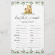 Sloth themed baby shower word scramble game card features a watercolor sloth illustration and watercolor greenery eucalyptus garland and elegant handwritten style font.