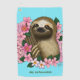 A cute sloth sitting amongst pink flowers against a backdrop of blue