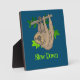 A cute drawing of a brown sloth clinging to a branch with leaves, hanging upside down. The words slow down written underneath in a cool lime green grunge font.