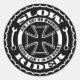 Round seal-emblem, "Slow Rider - Ain't got no worries, cause I ain't in no hurry", text with wrenches & Maltese Cross. B/W graphic, on t-shirts, sweatshirts, novelties, gifts.