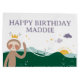 This Slumberkins Sloth birthday gift bag design features an adorable crowned sloth waving from a rolling green hillside beneath a soft pastel sky. A warm sunrise glows behind layered mountains while tiny birds, scattered stars, fluffy clouds, and delicate meadow details create a peaceful woodland celebration scene. “Happy Birthday” appears across the top with a custom name displayed prominently below, and a bold personalized age centered in the design to make the celebration extra special. The soothing color palette of sage green, golden yellow, soft lavender, and earthy brown gives the artwork a calm yet cheerful feel that pairs beautifully with a woodland or animal-themed party. With its sweet illustration style and personalized details, this Slumberkins sloth design makes birthday gifting feel thoughtful, charming, and full of warmth.