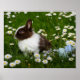 A simple, cute, lone rabbit casually nibbling on some fresh greens; surrounded by cute white daisy flowers.
