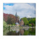 View of tranquil public green space featuring Minnewater Lake and small castle in Bruges during sunny day in spring, Belgium.