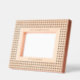 This cute horizontal orientation laser engraved wooden frame has a pattern of petite diamond patterned checkers and two an easy to personalize text areas above and below the frame's photo window.