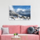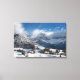 Canvas landscape print of the small village Sankt Magdalena in Villnoess valley with the Geisler Dolomites mountain peaks in the background covered in snow in winter season in South Tyrol, Italy.