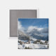 Souvenir photo magnet with the small village Sankt Magdalena in Villnoess valley with the Geisler Dolomites mountain peaks in the background covered in snow in winter season in South Tyrol, Italy.