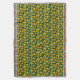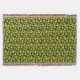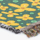 Seamless floral pattern with small yellow flowers and turquoise dots on dark green background.