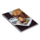 This adorable dog is sure to make you smile! She has on a pair of thick-rimmed black glasses while resting her head on a book (about dogs!).