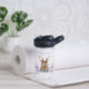 This sassy brown bunny is wearing stylish blue and white glasses with a matching bow tie. The rabbit is surrounded, on both sides by beautiful purple flowers. At the top there is room for a name. This design is on the front and back.