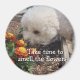 The design depicts a peaceful, free, happy and loving bichon taking time to smell the flowers
