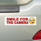 A funny car bumper sticker. Smile For The Camera. With a yellow cartoon face.