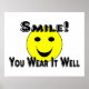 Sometimes all it takes is a simple smile to change your whole outlook on things. The next time you are feeling down, just smile! You wear it well! Featuring a bright yellow face!