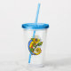 This acrylic drink tumbler with straw and lid has a brightly colored smiling lizard holding a leaf on a twig in colors of green, yellow, blue and orange.