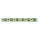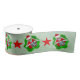 This roll of ribbon for Christmas is light green with a repeated image of a smiling skeleton holding ornaments up to his eyes wearing a red Santa hat inside a bright red and green splatter shape with bright red stars.