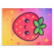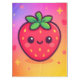 This adorable design features a single cartoon-style strawberry with a cheerful face, rosy cheeks, and expressive eyes. The strawberry is topped with vibrant green leaves and dotted with yellow seeds, set against a dreamy gradient background that transitions from soft pink to purple and yellow. Scattered hearts, stars, and dots add a whimsical and playful atmosphere, making the overall composition sweet and visually delightful.
