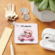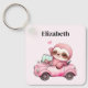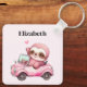 A keychain with a whimsical illustration. A pink sloth driving around in a pink convertible. Adorable.