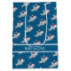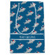 A gift bag with a pattern of smiling, cartoon, sharks wearing Santa hats and the customizable words ‘Merry Christmas’.
