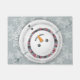 A wintery holiday "Welcome" doormat featuring a beautiful Snowman in striped scarf, gazing upwards into the falling snow.