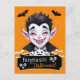 This Halloween postcard features a smiling vampire showing off its fangs, with bats flying around.