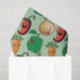 Smiling red chili peppers, green bell peppers, onions and carrots on a green polka dotted background.
