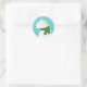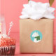 This sticker features a fun cartoon illustration of a cute polar bear wearing a green scarf. The background colour is blue with some snow.
