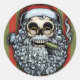 Santa Claus skull with long white beard, Santa hat, round glasses, and champing a smoking cigar. Colour, pen & ink drawing on t-shirts, sweatshirts, cards & gift items.